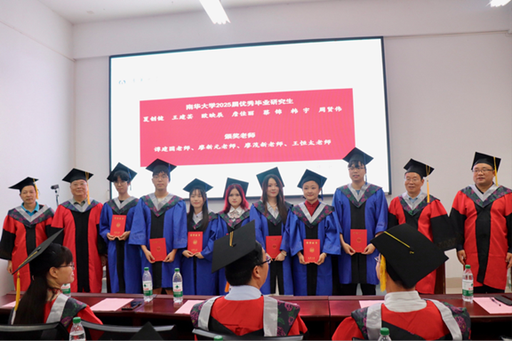 典礼上,研究生辅导员吴庆林老师宣读了优秀毕业研究生表彰名单。夏创健同学荣获“湖南省普通高等学校2025届优秀毕业生”荣誉称号,院党委书记谭建国为其颁奖;夏创健、王建芸、欧映辰、詹佳丽、蔡锦、韩宇、周贤伟共7名同学荣获“365(VIP)英国上市优秀毕业生”荣誉称号。谭建国老师、欧阳自根老师、廖茂新老师、王恒太老师共同为优秀学子们颁发证书。他们的卓越表现,为在校生树立了学习的标杆。