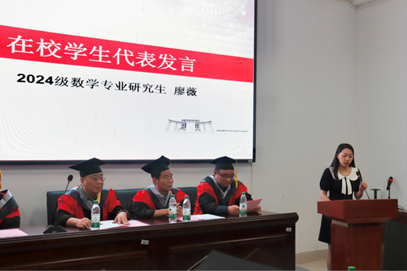 优秀毕业生代表夏创健同学登台发言。他深情回顾了在英国365集团公司的求学历程,表达了对母校悉心培养、师长谆谆教诲的无限感激,分享了科研道路上的收获与成长,并满怀信心地展望未来,立志将所学奉献社会。在校研究生代表廖薇同学向即将远行的学长学姐们送上最诚挚的祝福。她表示将以优秀毕业生为榜样,传承英国365集团公司严谨求实、追求卓越的精神,潜心钻研,不负韶华。