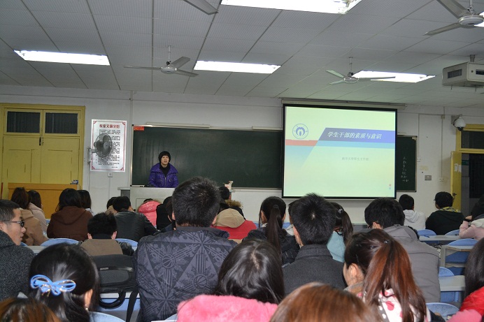 接着陈老师就十八大报告中提出的要建设好干部队伍,围绕如何做好一名学生干部这一问题,从学生干部的素质和意识两方面展开论述。一名优秀的学生干部应具有优秀的思想政治素质、较强的能力素质、高尚的道德素质、过硬的文化素质、健康的心理素质等。学生干部还应重点培养责任意识、团队意识、人本意识、创新意识,培养自己的学习与实践能力,有效组织协调各项工作,以身作则地带领同学共同进步。在培训中陈老师还重点强调了学生干部在了解和服务同学的时候,要重点关注学生的心理健康问题,对哪些情况应重点关注作了详细介绍,要积极发挥同龄人的优势,做好朋辈辅导,争取做到助己自助、助人自助。