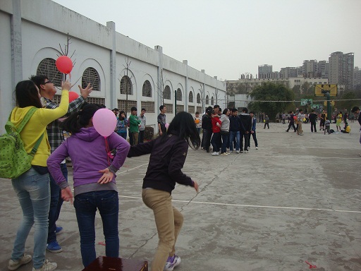 活动分为“星语心愿”、“爱心签语”、“放飞心灵,勇往直前”三大部分。“星语心愿”部分,各班女生写下愿望放到一个暗箱里,随机点取男生抽取纸条,被抽到的男生照着纸上的要求帮女生完成愿望。女生们的愿望花样百出,男生们应接不暇,但却都发扬了绅士风度,用最高的热情为女生们捧场。接着男生们的“爱心签语”更是表达了男生们对女生们的真诚的祝福;随后的“放飞心灵,勇往直前”将活动推向了高潮,跳绳比赛、夹气球比赛、十人十一脚等比赛项目让现场热闹非凡,几乎每个到场的同学都参与其中。