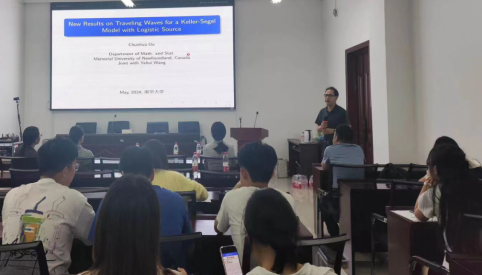 第二场讲座以《Speed Sign of Traveling Waves to a Competitive Lotka-Volterra Integro-Difference System with Bistable Nonlinearity》为题,由欧春华教授主讲。在此次讲座中,他讨论了两物种竞争系统中双稳态行波的波速符号,模拟了两物种争夺共同资源的动力学过程。欧教授对生物学中观察到的行波传播现象进行了深入探讨,为我们理解这一现象提供了新的视角和方法。欧教授演讲严谨细致,对每个观点进行深入分析,为听众带来了丰富而有启发性的学术体验。他的逻辑清晰,讲解精彩,使得听众在学术探索中获益匪浅。