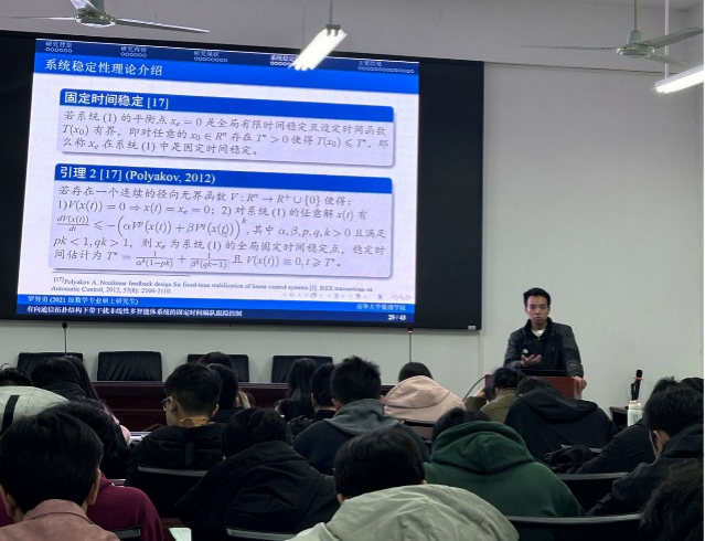 会上,两位报告人分别就多智能体系统编队控制问题和Lotka-Volterra三物种竞争系统展开了精彩的介绍。罗智勇在描述多智能体系时结合了大量的实际案例进行说明,深入浅出的展示了多智能体系的结构。并且结合图例,引导听众参与思考,进一步理解其本质含义。胡舒霖在介绍Lotka-Volterra三物种竞争系统的行波稳定性时,详细的展示了相关方程,并逐步解析其内涵。通过数学推导,揭示Lotka-Volterra三物种竞争系统的内涵。