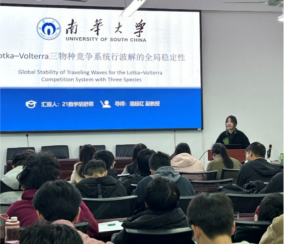 胡舒霖进行了以Global Stability of Traveling Waves for the Lotka–Volterra Competition System with Three Species为题的报告。该汇报主要阐述了Lotka-Volterra三物种竞争系统的行波稳定性,说明了行波解的渐近性,建立了加权泛函空间下的局部稳定性和全局稳定性。她特别指出,对于局部稳定性,采用谱方法证明;对于全局稳定性,采用比较原理和压缩定理相结合的方法证明。
